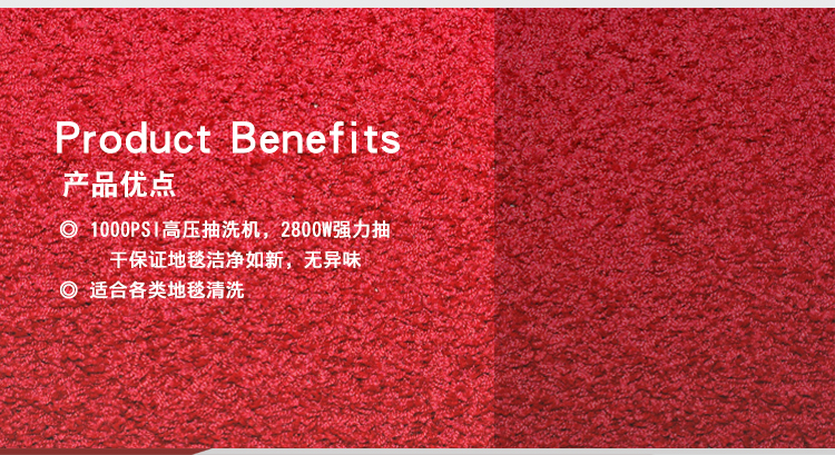 ◎1000PSI高壓蒸汽清洗,2800W同步強(qiáng)力抽吸,地毯快速恢復(fù)原貌。